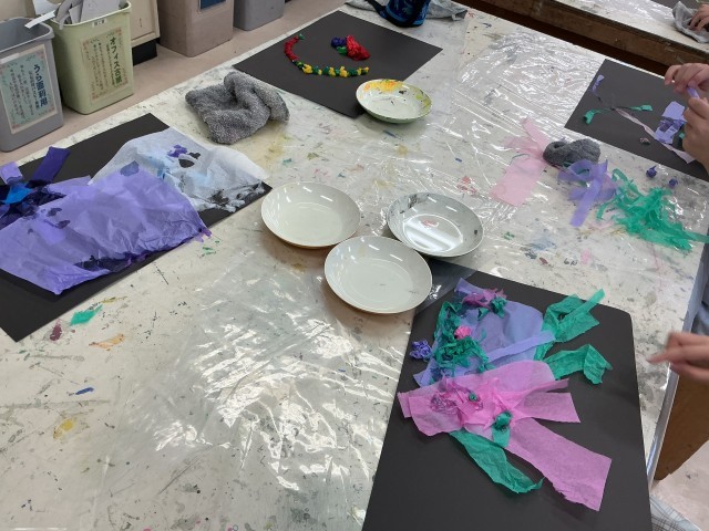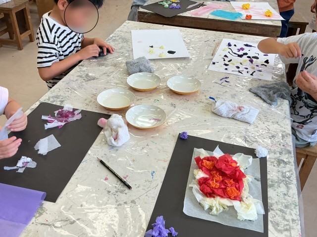 お花紙を丸めたり、ちぎったり、重ねたりと素材を楽しみながら素敵な作品がたくさんできました。