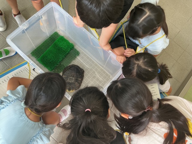 そのため、三茶小にいるカメ・メダカ・ザリガニ・グッピー・キンギョを触ったり鑑賞したりする「さんちゃすいぞくかん」を実施しました。