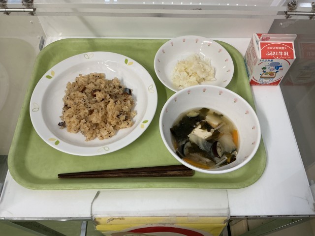 今日の給食では、炊いた有機米と味をつけて焼いた“さんま”を合わせて仕上げた「さんまごはん」、有機野菜は、「粉ふきいも」のじゃがいも、「具だくさんみそ汁」に、にんじん・玉ねぎを使いました。