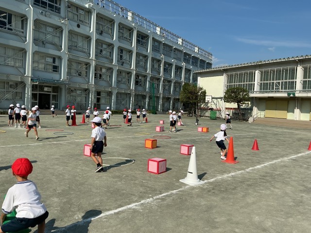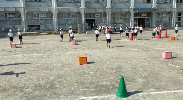 それぞれのチームで話し合いながら、フラフープやケンステップ、箱を組み合わせてオリジナルコースを作りました。速く走りながら跳ぶためにはどうしたら良いか話し合い、置く位置や距離を工夫して何度も試していました。
