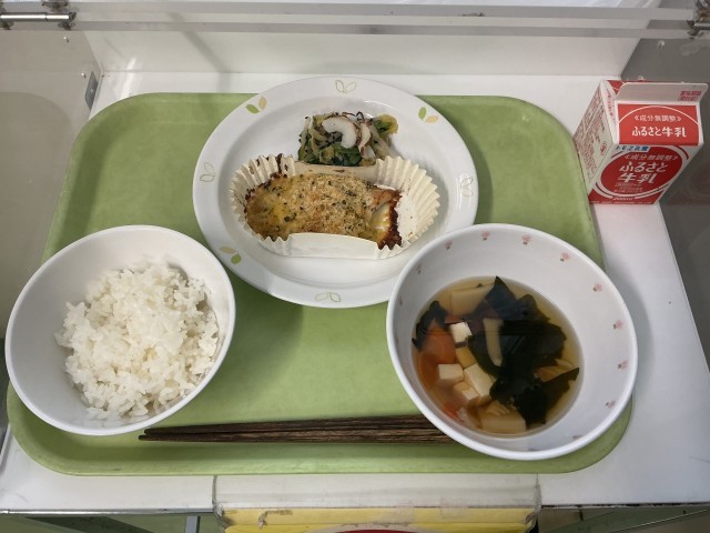 ◎「魚のコーンマヨネーズ」今日は赤魚を使い、コーン(ホールコーン・クリームコーン)とマヨネーズのほかに、みじん切りした玉ねぎやマッシュルーム、スキムミルク、レモンなどで作った給食室特製コーンマヨネーズを魚にかけて、さらにパン粉パセリ粉チーズをかけて焼きました。