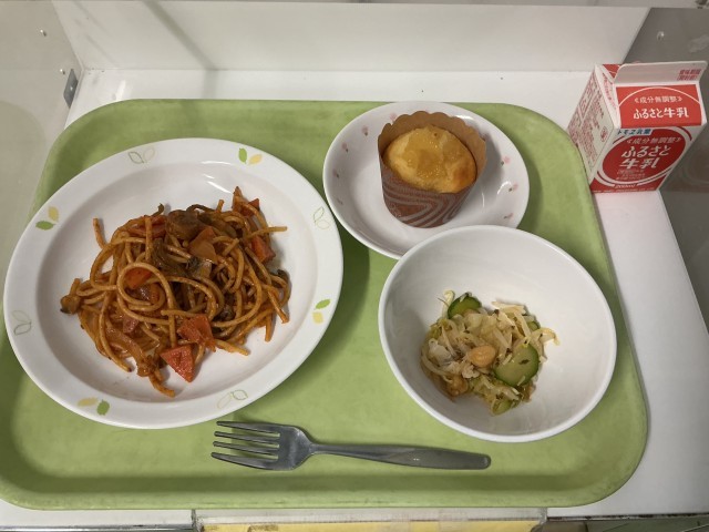 ◎「りんごマフィン」は、りんごと砂糖で煮た給食室特製りんご煮をマフィンの生地に混ぜてカップに入れて、さらに上からもりんご煮をのせて焼きました。