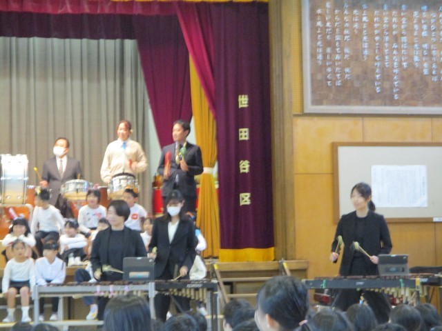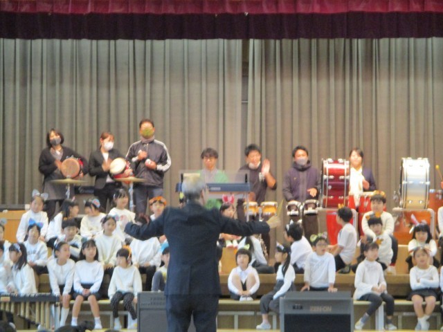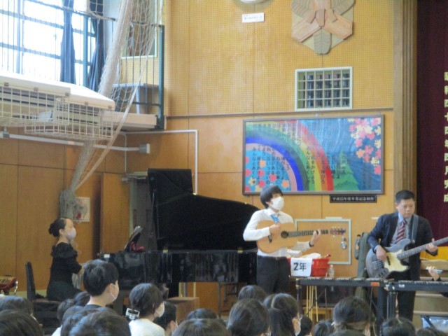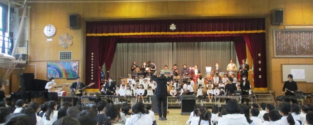 プログラム3番は、「はじめようコンサート」の全校合唱です。合唱の伴奏として、ステージ上に”特別ゲスト”が登場しました。この日のために練習を重ねてきた、教職員のメンバー♪です。校長先生の式に合わせて、みんなで元気に合唱しました。