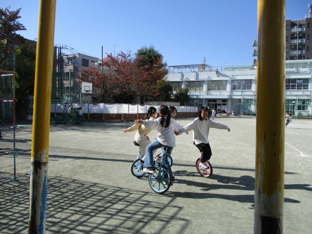 校庭の木々も色づき葉を落とし始めています。気持ちの良い秋晴れの下、中休みの校庭では1・2・5年生が元気に遊んでいます。ジャングルジムやうんていで遊ぶ子、鬼ごっこで走り回る子、バスケットボールや一輪車などを楽しむ5年生など、元気な声が響き渡りました。