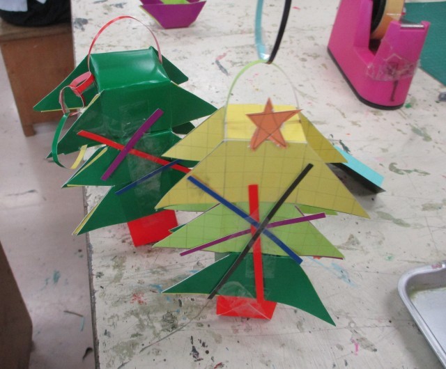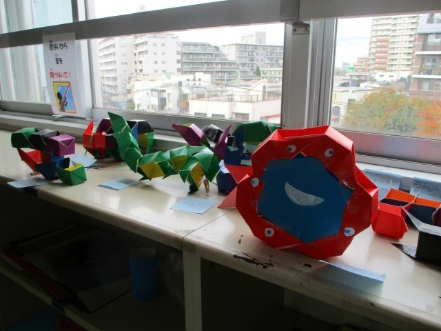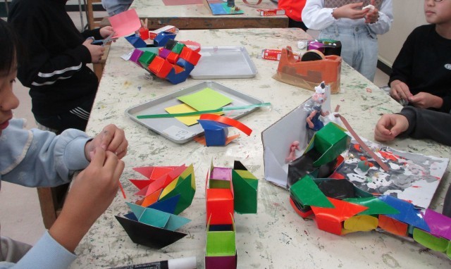 4年生は図工の時間、「プチBOX」の仕上げに取りかかっていました。12㎠の正方形の工作用紙に色紙を貼り、切ったり、折ったり、貼りつけたり、工夫しながら組んで完成をめざしていました。