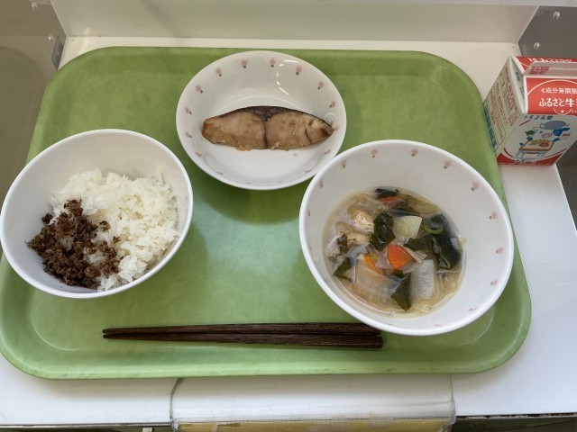 ◎「具だくさんみそ汁」には9種類の食材を入れました。その中の一つ“かぶ”は、いつも葉の部分もついて届きます。今日は刻んで「青菜入り手作りふりかけ」に青菜のひとつとして使いました。他に、だしを取った後の“けずりぶし”は、捨てずによく水分をきって、じゃこと一緒に細かくして、ごまや調味料も入れてふりかけを作りました。