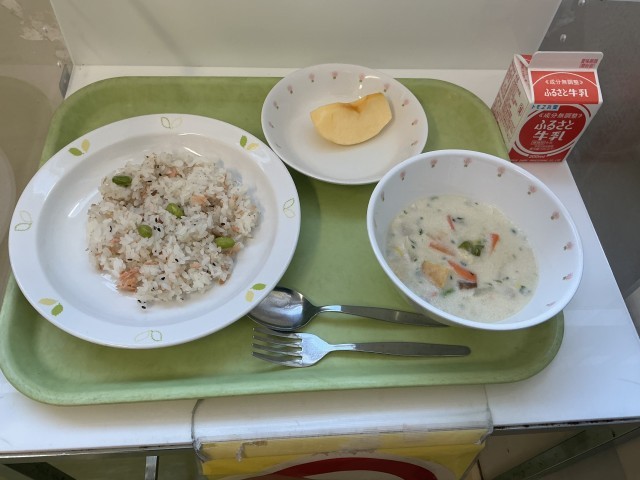 ◎「鮭ごはん」は、焼いた鮭の切り身を給食室で皮と骨を取り除いて、さらにほぐし身と枝豆を調味、加熱して、ごはんとごまと混ぜ合わせて仕上げました。