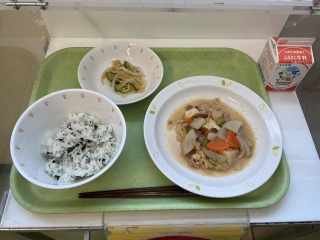◎月1回の有機米を使う給食です。今日の「わかめごはん」にしました。