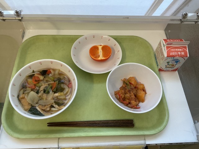 ◎「じゃがいもと鶏肉の変わりあえ」は、下味をつけてあげた鶏肉と素揚げしたじゃがいもを、炒めた玉ねぎとピーマンと合わせました。“変わりあえ”は、白みそ・豆乳・牛乳・生クリーム・ケチャップなどいろいろ使って味付けしたところにあります。