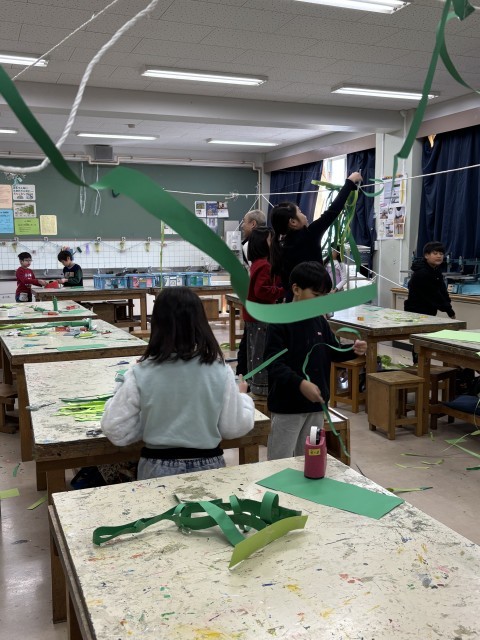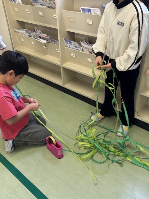 途中で途切れてしまったり、絡まってしまったり、苦戦しつつも、みんなで力を合わせて画用紙で作った蔓を伸ばしている子どもたちはどの子も生き生きと楽しそうな表情でした。