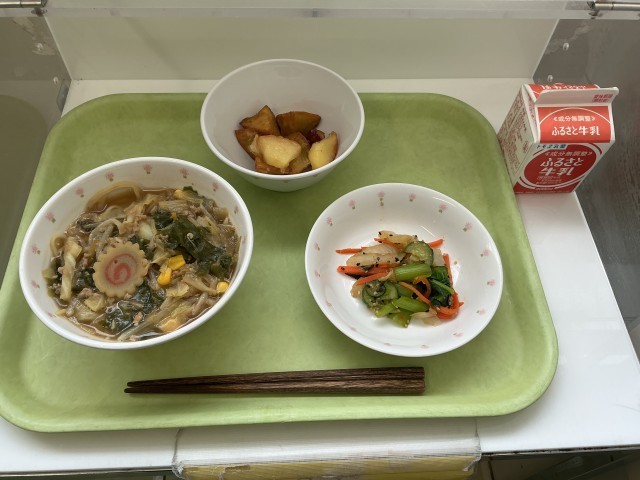 ◎昨日の「豆カレーライス」では、有機米を使いました。今日は、有機野菜を使った給食です。「みそわかめラーメン」には有機玉ねぎ、「中華サラダ」には有機にんじん、「りんご入り大学芋」には有機さつまいもを使いました。