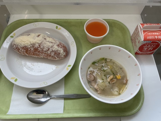 今日は、その中でも1位献立です。1位は「揚げパン」でした。色々な味付けがありますが、今日はスキムミルクと砂糖で作ったミルクシュガーを揚げたパンに絡めて仕上げたものです。
