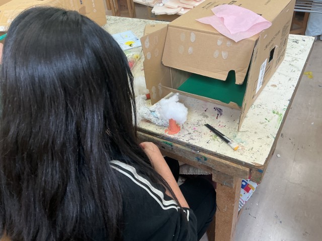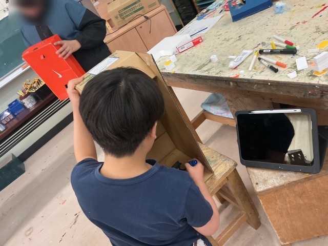 5年生の図工です。段ボールに穴を開けて、そこからのぞいて楽しい景色を様々な材料で作っています。日常の生活では「のぞく」行為は怒られることが多いですが、今日は「のぞく」を大事にしようと伝えました。5年生最後の図工の学習になります。今まで学んできた用具や材料、技能を活かして取り組みました。