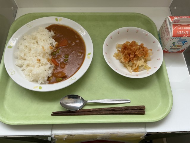 今日の6年生のリクエスト給食は、「カレーライス」と、揚げたワンタンの皮を入れた「パリパリサラダ」です。