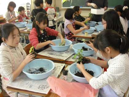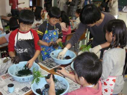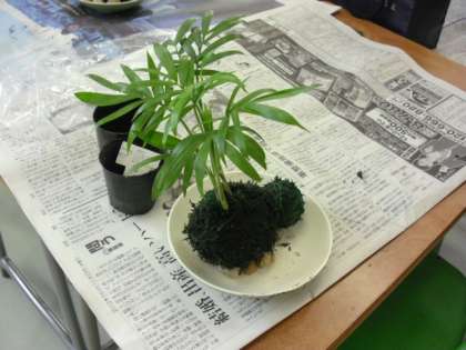 2年に一度の展覧会。二日目は恒例の「アートランド三茶」です。これは前身の「造形フェスティバル」から数えると今回で6回目の行事で、表現することの楽しさを体験することをねらいに行っています。保護者や元保護者、地域の方々や教職員が講師になって、全部で13の講座が開かれました。まずは「苔玉アート」です。