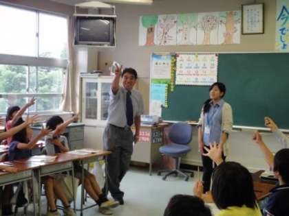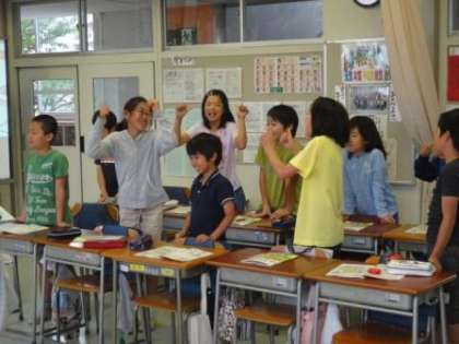 英語でジャンケン、松橋先生が子どもとジャンケン、英語で「ロック、シザーズ、ペイパー、ワン、ツー、スリー」と盛り上がっていました。英語の歌を歌いながら踊って楽しんでいました。