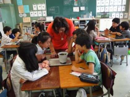 インゲン豆の芽生えを観察して、気がついたことを発表させながら、インゲンマメが双葉になったり栄養をあげていることを子どもたちに気づかせていまいた。子おdもたちの気ずきの発言を良くほめて、発表することが楽しくなる授業でした。
