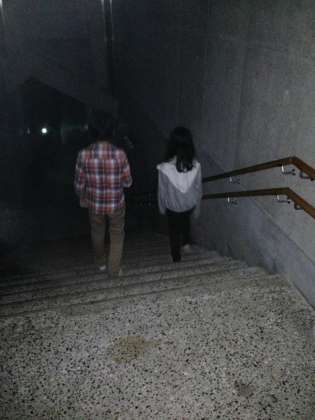 宿舎を暗くして、2人組で夜の宿舎を探索です。暗い中を終って体育館でほっと一安心。