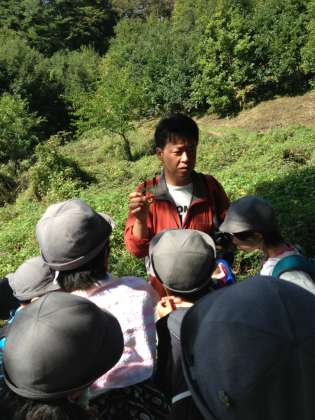 ヒロイド原ハイキング、自然ガイドさんの説明に真剣に聞き入ってます。
