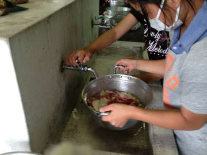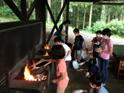 野菜を切り、お米をとぎ、かまどでの火起こし、協力してのカレーライス作りです。