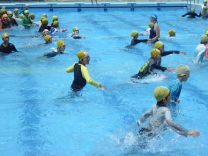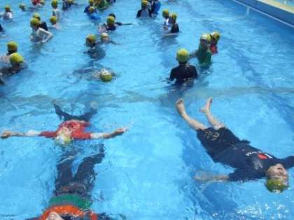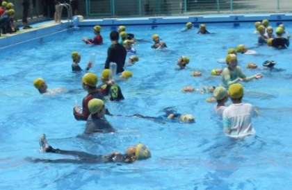 夏休みに子どもたちは、海に湖に川にと出かけます。もし、水の事故にあったときのために、夏休み前に毎年行っている着衣泳の安全指導です。ぬれた洋服に気持ち悪がっていた子も、慣れるに従い、水に中で楽しんでいました。背泳ぎで長く浮く練習やペットボトルを使っての浮き遊びにおおはしゃぎでした。このような経験が、もしもの時に役だってくれればと思います。