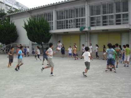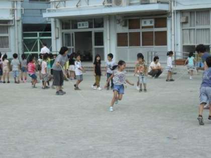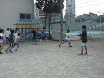 2学期始めての体育朝会です。2学期は、長なわとびを中心に進めていきます。毎月学級ごとの長なわとびの回数を記録して、2学期末には、最高の記録を出そうと目標をたてさせました。1年生は、まだ跳べませんが、2学期末にはいい記録をだせるようになります。2学期、長なわとびをがんばります。