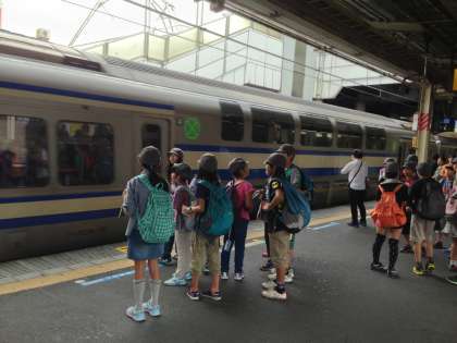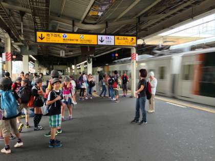 縦割班行動での鎌倉遠足です。戸塚駅で鎌倉行きを待っています。