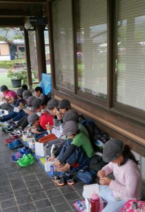 軒下でみんなでなかよくお弁当を食べています。