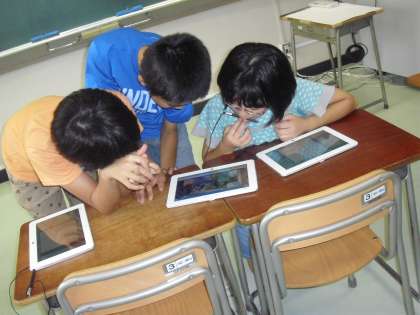 「I can 〜」「I can't〜」を用いて、友達に分かりやすく「できること」「できないこと」を紹介する活動を取り入れた学習です。タブレットを活用して、自分の自己紹介を撮り合いました。後で確認して、もっと大きな声で言った方がいいとか、動作を大きくしようとか意見を出し合っていました。