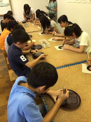 職員の方に、彫刻刀の使い方と彫り方を教えてもらい、その後彫り始めました。みんな真剣な表情で彫っています。
