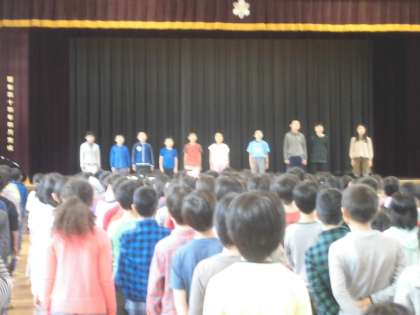 4月8日(金)、今年度初めての音楽朝会を行いました。校歌をみんなで元気いっぱい歌い、素敵な声を体育館に響き渡らせました。月曜日の「一年生を迎える会」で、この校歌を一年生のみなさんに披露します。口を大きく開けて、上手に歌えている子たちは舞台の上に上がって歌いました。