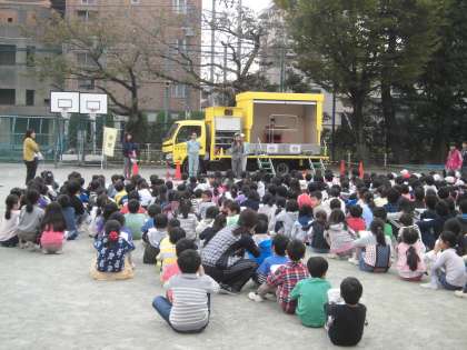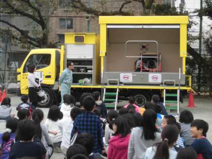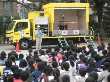 11月8日(火)の5校時、11月の避難訓練を行いました。緊急地震速報が流れた直後、子どもたちは「お・い・た」の約束(学校便り参照)を守って身をかがめ、揺れが収まってから校庭に避難しました。今回は、地震の揺れを体験できる起震車に来てもらって、例年通り4年生が全員体験しました。いつ起こるか分からない地震、場に応じた行動がとれる子になってほしいと願って指導しています。