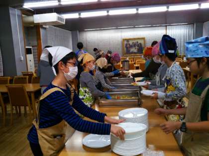 宿舎最後の朝食の準備をしてます。食事係も慣れてきました、