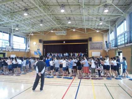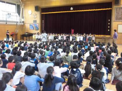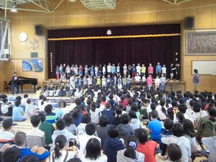 「フレール・ジャック」を学年順に輪唱した後、合唱団がお腹を使う呼吸の練習の見本を見せ、全員でお腹を使う呼吸練習をしました。