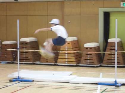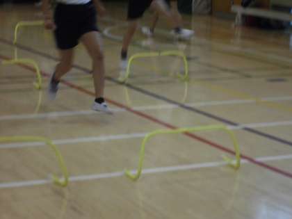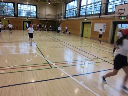今朝は雨天のため、体育館内でハードル走と、走り高跳びの練習をしました。