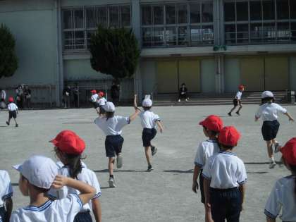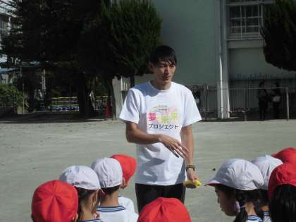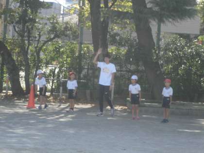 1年生が3時間目に校庭で、北京オリンピック陸上競技の銀メダリスト(男子4×100mリレー)の高平慎士さんに、速く走る秘訣を伝授されました。