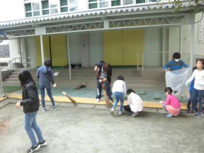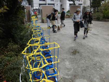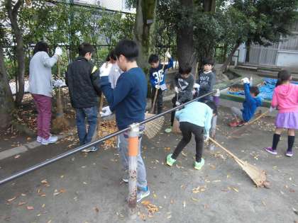 上級性が下級生に声をかけながら、一生懸命に落ち葉を掃いたり、集めたり、拾ったりしていました。