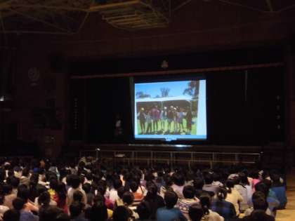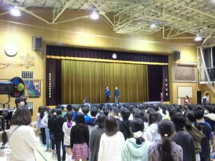 今朝は、区の海外派遣事業(5年生)に参加した児童の報告がありました。