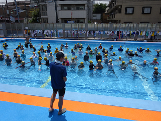 高学年の児童が、服を着たまま水に落ちた時のことを想定した「着衣水泳」を行いました。