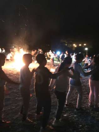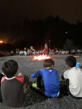 火を囲んで、ジェンガやオクラホマミキサーを踊って、盛り上がりました。だんだん火が小さくなってきて、最後は火を眺めながら、今日の感想を振り返りました。