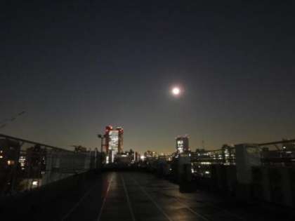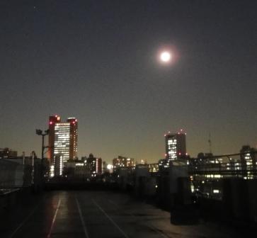 21日5時頃皆既月食が見られます。ただ、天気予報では明日は曇りか雨の予報です。そこで、今日20日の月齢14日の月をお見せします。もし、明日晴れていれば三茶小の屋上より月食の赤い月をキャロットタワーの右上のほうに見ることができます。晴れてほしいですねえ。