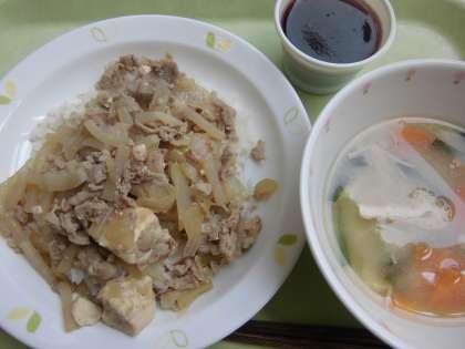 3 フライパンに油をしき、豚肉をいためて、玉ねぎ、調味料をいれる。豆腐を入れて、最後にねぎを入れる。
