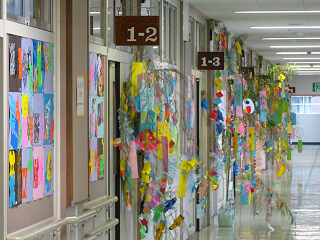 2階の廊下を歩いていると、さらさらと気持ちのいい音がします。1年生と2年生が作った七夕飾りの音です。折り紙で作った飾りや、思い思いの願い事が書かれた短冊が枝に下げてありました。笹を譲ってくださった地域の方に感謝申し上げます。