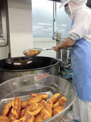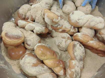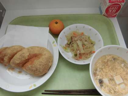 あげパンは高温で揚げ、しっかりと油を切らないとおいしくできません。パンはきなこがたくさんくっつくように、ねじりパンを使用しました。調理員さんの技術のおかげでおいしい揚げパンができあがりました。