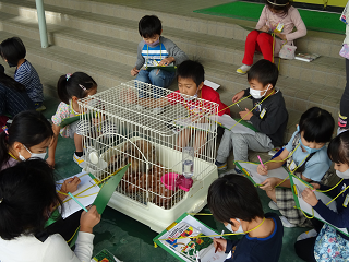 この日の1年生は、学校内で飼育しているウサギとカメの観察をしました。