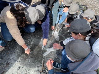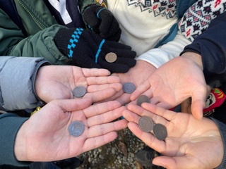 源泉が近くなると、硫黄のにおいがしました。10円をつけて、変色するか実験をしました。