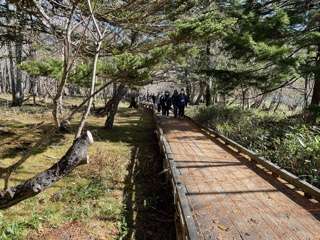 木道を歩いてハイキングスタート!湯の湖の周りを半周して、湯滝の横を下っていきます!