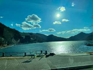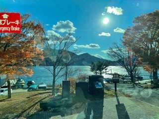 菖蒲が浜から汽船に乗る予定でしたが、強風により欠航になってしまいました。楽しみにしていたので残念です。バスでホテルに帰る途中の中禅寺湖です。
