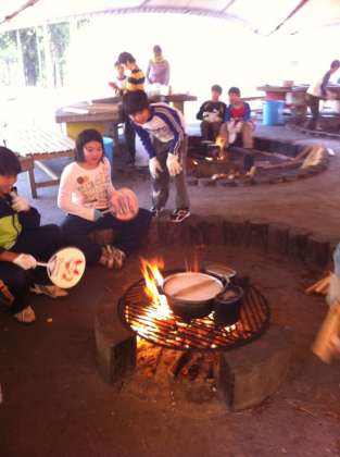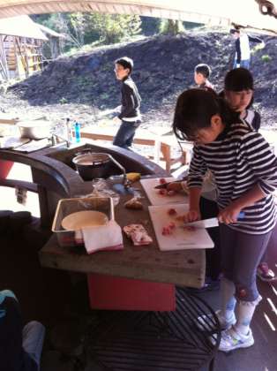 初めての釜戸に火を起こしてのカレーライス作り、煙と格闘してがんばっています。