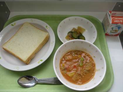 *わかりづらいですが、パンには給食室特製大豆ドライカレーをはさんでいます。また食具には、スプーンとフォークを出しています。